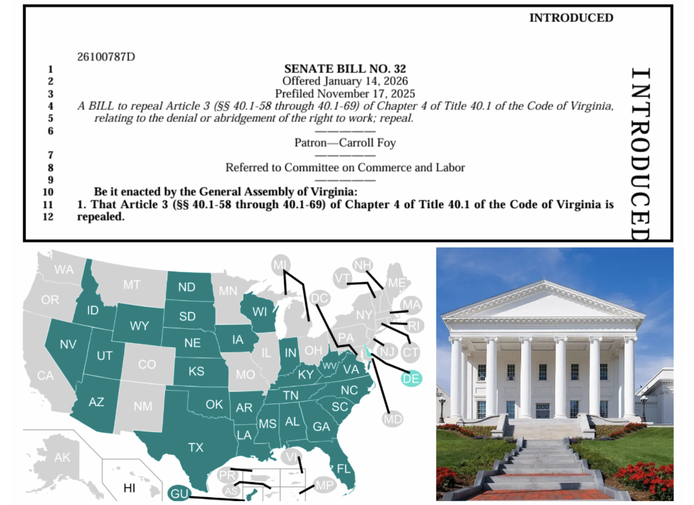 The labor landscape in Virginia is heating up ahead of the upcoming General Assembly session. Lawmakers are signaling that labor policy may become a major flashpoint, with proposals to repeal the Commonwealth’s Right-to-Work law rising to the top of the agenda.