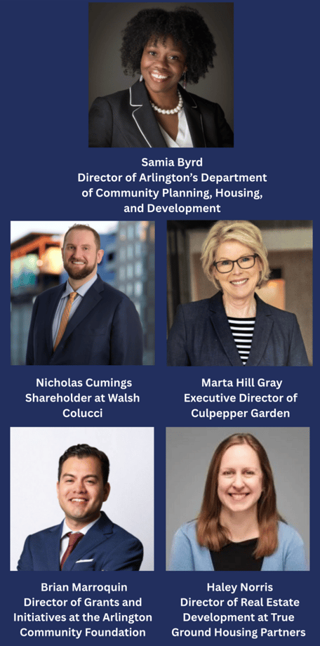Samia Byrd, Director of Community Planning, Housing, and Development, provided a powerful framework for understanding Arlington’s affordability gap. A dynamic panel featuring Nicholas Cumings, Walsh Colucci, Marta Hill Gray, Culpepper Garden, Brian Marroquin, Arlington Community Foundation, and Haley Norris, True Ground Housing Partners, shared insights on real-world strategies, partnerships, and innovations that define affordability in practice.